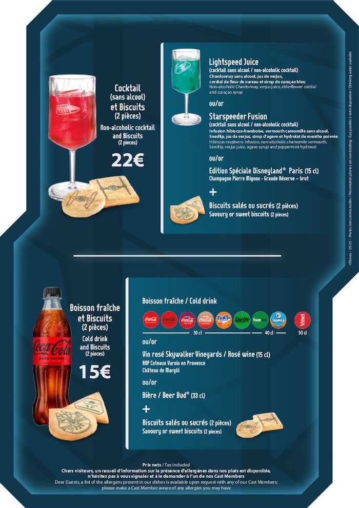 Paquete de 22 €: Incluye un cóctel sin alcohol (puedes elegir entre Lightspeed Juice o Starspeeder Fusion) o una copa de Champagne Pierre Mignon (15 cl), acompañado de dos galletitas temáticas (dulces o saladas). Las galletas están inspiradas en el universo Star Wars, ¡y tienen una pinta espectacular!